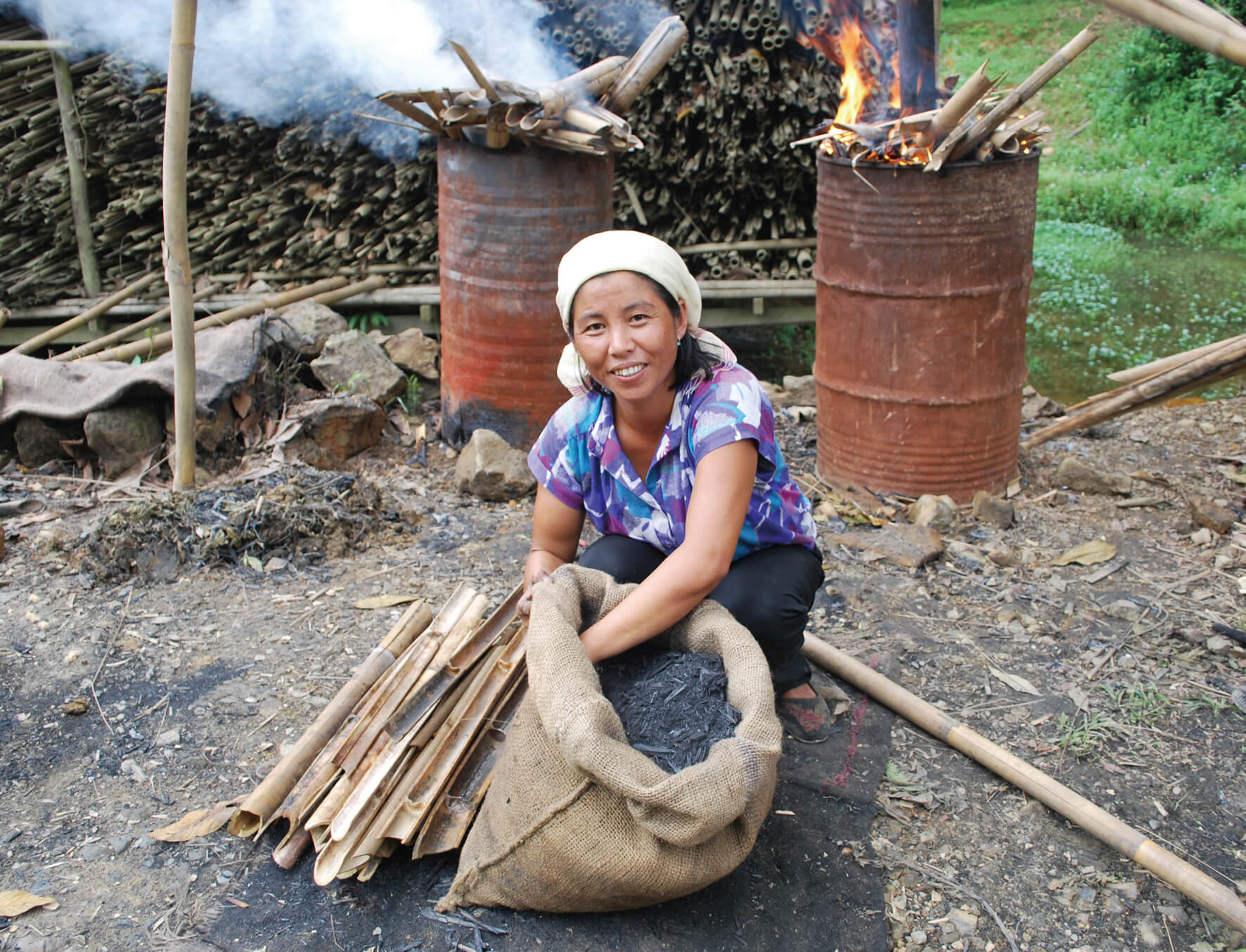 Because it grows fast, bamboo can provide a more sustainable alternative than timber and other commonly used forms of biomass energy: a report in Ghana showed that charcoal from bamboo had a lower eco-cost and carbon footprint than teak and acacia, two other plants used to make charcoal. It is also easy to produce in the home, using cheap technologies. A number of INBAR projects have spread bamboo charcoal use across countries including China, Ethiopia, Ghana, India, Madagascar, the Philippines, Viet Nam and more.